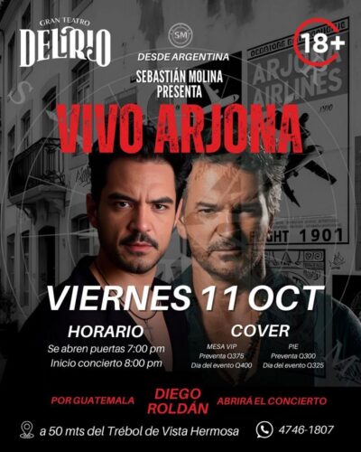 El show «Vivo Arjona» tendrá lugar el viernes 11 de octubre en el Gran Teatro Delirio, ubicado en el Kilómetro 7.5, al final del Boulevard Los Próceres, Zona 10, a partir de las 20:00 horas. Como representante del talento nacional, se presentará Diego Roldán. Los boletos ya están disponibles en preventa y se pueden adquirir a través de WhatsApp al 4746-1807 o en taquilla el día del evento.