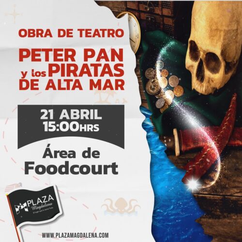 Para todos los que disfrutan de las aventuras mágicas se llevará a cabo un espectáculo lleno de emociones y diversión, con Peter Pan y los piratas de alta mar en un enfrentamiento con el capitán Garfio en la tierra de Nunca Jamás. En el área de restaurante a las 3:00 de la tarde el domingo 21 de abril.