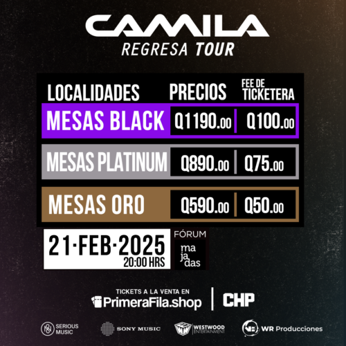 CHP en su conmpromiso con experiencias unicas y de primer nivel a los guatemaltecos, presenta el regreso de la banda mexicana «Camila», en su «Regresa Tour», un show cargado de sentimiento con sus emblemáticas canciones románticas.