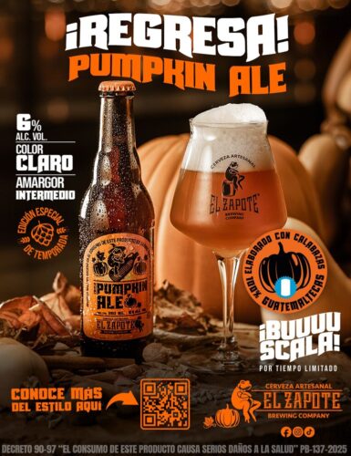 La Pumpkin Ale de El Zapote es una cerveza de fermentación alta, de color ámbar a cobre, con sabores ricos y dulces a malta. Los lúpulos son ligeramente especiados, infusionada con más de 250 libras de pasta de calabaza 100% guatemalteca, nuez moscada y canela. Al completar este procedimiento es nuevamente infusionada con calabazas deshidratadas. Su cuerpo es generalmente de medio a pleno, y presenta un final sutil y tibio que acompañan bien la época de lluvia y frío. Además, contiene un 6% de volumen alcohólico y es de un amargor muy moderado.