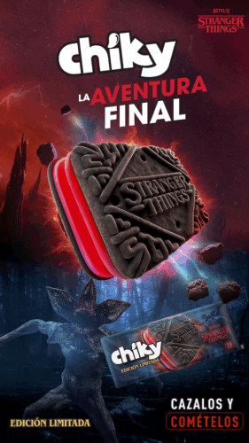 La edición limitada presenta una galleta de chocolate con relleno de cereza, desarrollada exclusivamente para esta colaboración. Además, su empaque refleja el espíritu innovador de Chiky, fusionando su estilo con elementos del “Upside Down” para conectar con los fanáticos de la serie y la cultura pop. La producción implicó además el diseño de cinco moldes inspirados en los monstruos de la serie y el icónico logo de Stranger Things.