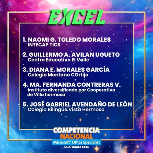 Naomi Gabriela Toledo Morales representante del Centro TIC´s del INTECAP, obtuvo el Primer lugar a nivel Nacional en la Categoría de Excel Especialista, siendo la campeona que representará a Guatemala en el Campeonato Mundial de #Microsoft Office Specialist.
