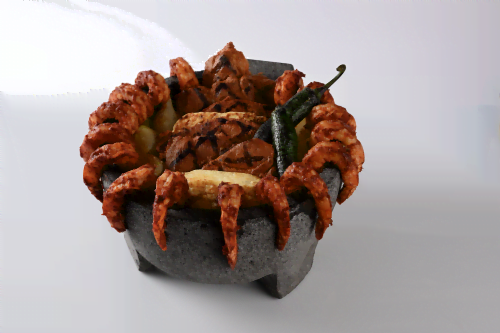 El Molcajete El Patrón: camarones zarandeados, filete de cerdo adobado y queso asado sobre nuestra salsa molcajeteada, cebollitas cambray y chile toreado.