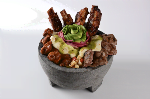 El Molcajete Regio: combinación de deliciosas carnes; costilla de cerdo en salsa barbacoa, tampiqueña de res, alitas de pollo con salsa guajillo sobre nuestras papas Xico y cebollitas cambray.