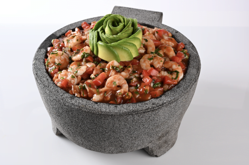 Molcajete Veracruzano: frescos camarones marinados en jugos cítricos, sazón de especias y combinación de tomate, jalapeño, cebolla, cilantro y jugo de tomate.