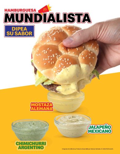 Asimismo, para esta temporada McDonald’s ofrece la “Hamburguesa Mundialista”, preparada con un pan especial en forma de pelota, 100% carne de res, queso, tomate y lechuga, la cual puede ser dipeada con su sabor favorito: Mostaza Alemana, Chimichurri Argentino y Jalapeño Mexicano.