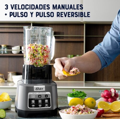 La Licuadora Profesional Oster® XTREME MIX incluye 3 programas automáticos iBlend para triturar hielo, procesar alimentos y hacer smoothies, así como 3 velocidades manuales (Baja, Media y Max Crush), y funciones Pulso y Pulso Reversible. Además, los programas se detienen automáticamente al finalizar, ofreciendo mayor comodidad y resultados consistentes en cada preparación.