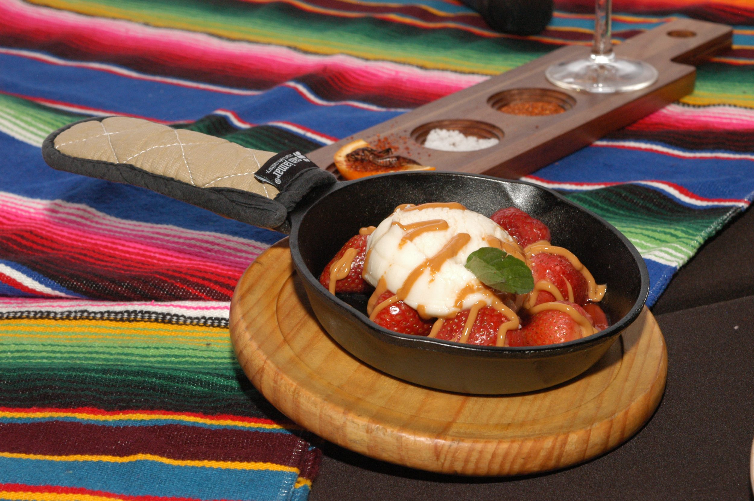 cazuela caliente, con fresas salteadas en nuestra salsa tequilera y flameadas en tequila, decoradas con una bola de helado de vainilla. Ideal para compartir (2 personas).