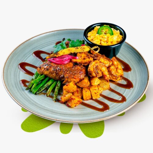 - MAR Y MAR: fresco róbalo sazonado con el rub del Chef, con camarones zarandeados en nuestra salsa chipotle-chillón y polvo de chiles, servido sobre ejotes salteados y papas cubo, decorado con elotito baby tatemado y cebolla morada encurtida. Acompañado de nuestros deliciosos esquites mexicanos.