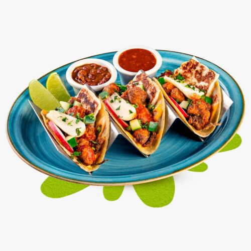 - TACOS DE CARNITAS DE PULPO: tortillas de maíz decoradas con nuestra salsa mayo chipotle y fresco pulpo sazonado con mezcla de especias y polvo de chiles, queso panela asado, cebollitas cambray taqueras, pepino y rábano. Acompañados de frijoles rancheros y salsa de chile de árbol.