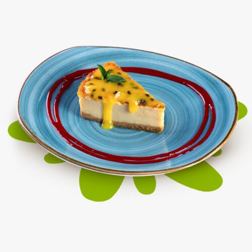 Pie de queso con salsa de maracuyá: Exquisito pie de queso sobre crujiente base de galleta, bañado en salsa de maracuyá.