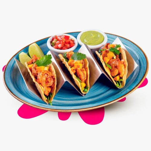 - TACOS DEL MAR: Tacos de tortilla frita rellenos de camarón zarandeado en mezcla de chiles, mango tatemado, nuestra mayo chipotle y lechuga. Acompañados de pico de gallo, salsa de aguacate y limón.