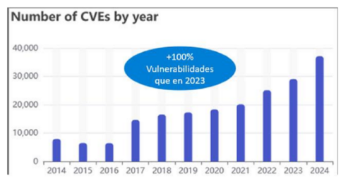 Pie de imagen: Histórico de vulnerabilidades reportadas por año que muestra un pico de detecciones en 2024