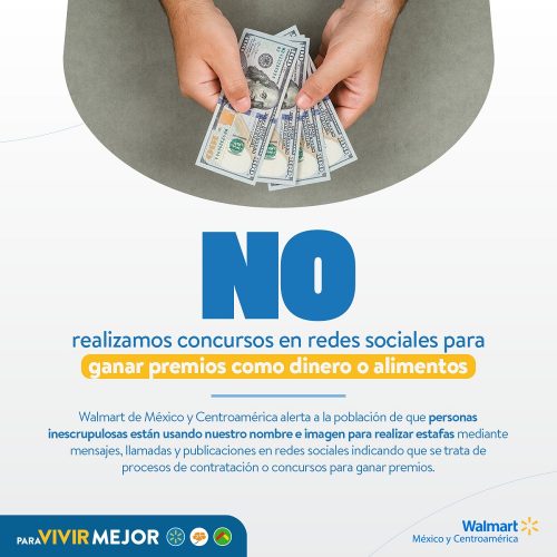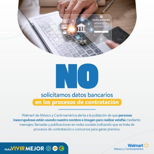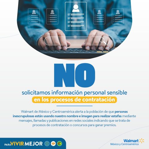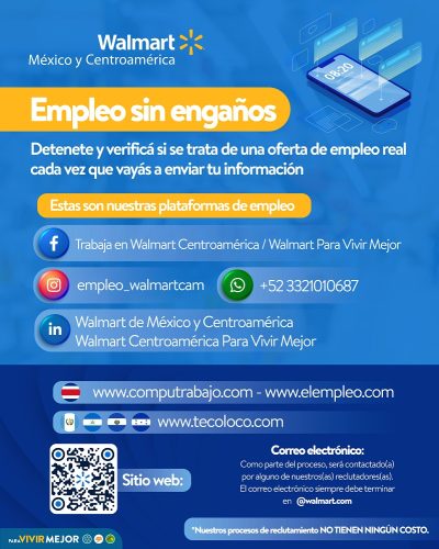 Walmart de México y Centroamérica en Guatemala una vez más reitera su compromiso con la transparencia y la seguridad en sus procesos de contratación, y exhorta a la colaboración de los guatemaltecos para prevenir posibles engaños y mantener un entorno laboral seguro para todos.