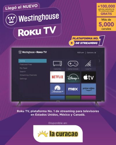 Westinghouse, una marca reconocida por su innovación y calidad, presenta su nueva línea de televisores inteligentes equipados con el sistema operativo Roku TV, líder en entretenimiento en streaming. Esta línea, que se comercializa exclusivamente en La Curacao y Almacenes Tropigas, ofrece una experiencia de entretenimiento inigualable gracias a su interfaz amigable, sencilla y a su amplia selección de contenido, convirtiendo el hogar en un verdadero centro de entretenimiento.